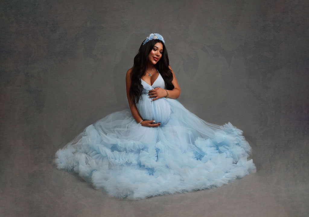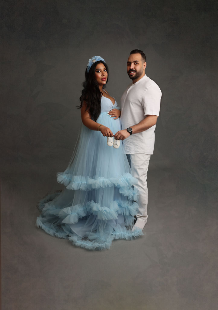 Dressed in elegant white, the couple captures the joy and anticipation of welcoming their little…
