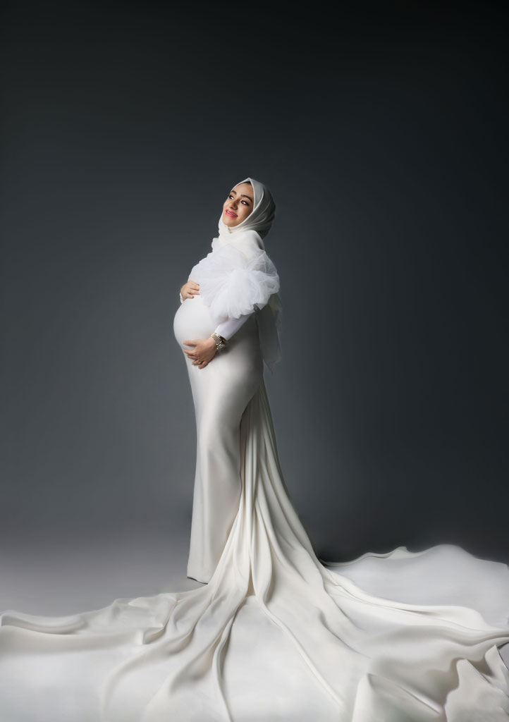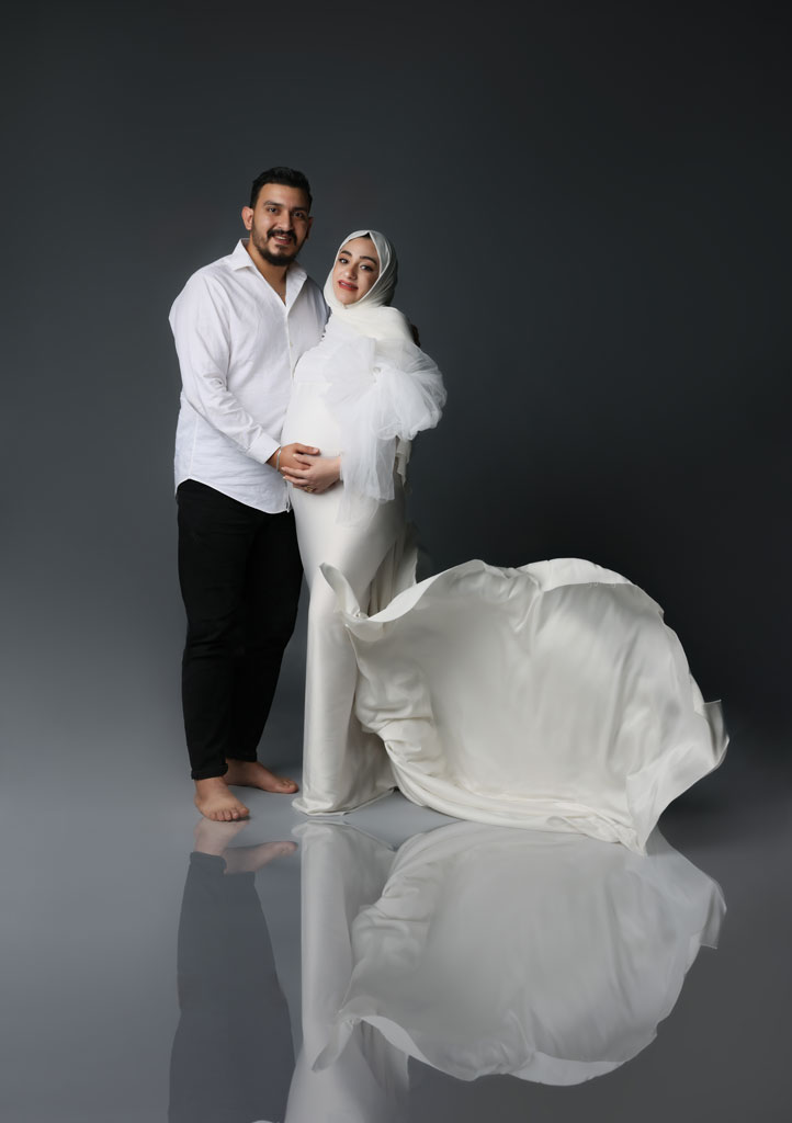 Dressed in elegant white, the couple captures the joy and anticipation of welcoming their little one, showcasing love and togetherness in every frame.